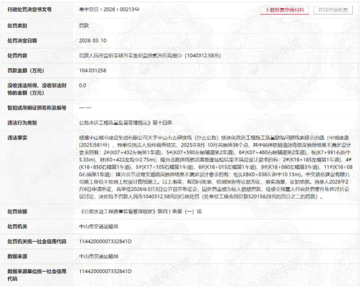 行政处治书指出,开云中交路桥诞生有限公司施工单元不按照工程蓄意图纸施工,有征询笔录、检测申诉等凭证为证。因处治金额为较大数额罚金,经提交中山市交通输送局紧要行政处治案件集体意象会议意象,决定赐与罚金东谈主民币1040312.58元的行政处治(处单元工程契约价款52015629元的百分之二的罚金)。