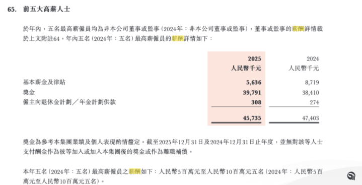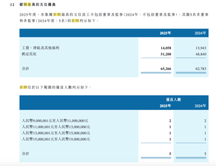 中信证券港股年报炫耀,2025年度和2024年度,集团薪酬最高的五位雇员均为境外子机构遴聘的腹地化职工,其薪酬均基于其向本集团提供奇迹的所得。这五名职工中,2东谈主薪酬位于900万元-1100万元之间,另3东谈主超1100万,最高者在1500万元至1900万元之间。