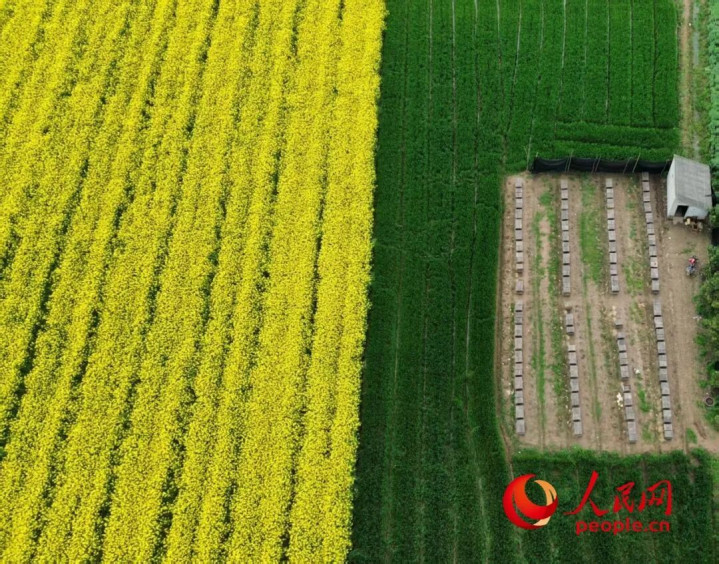 油菜花田隔邻的蜂场。东说念主民网记者黄钰摄