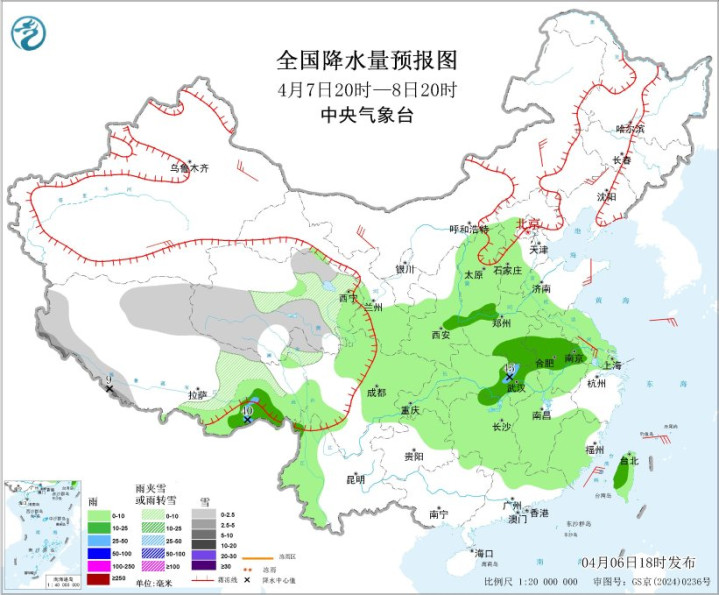 图2宇宙降水量预告图(4月6日20时-7日20时)