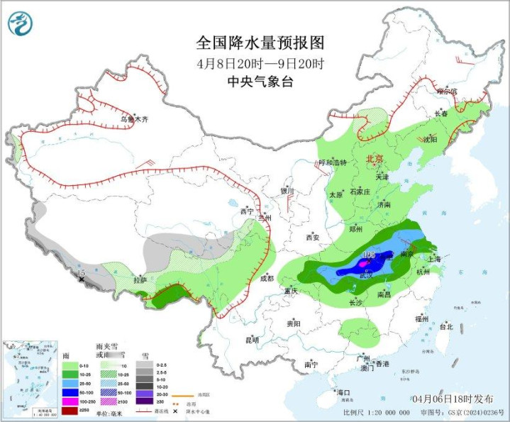 4月8日20时至9日20时,西藏东北部和西南部、青海南部等地有小雪或雨夹雪,其中,西藏西南部部分地区有中到大雪,局地暴雪(10~15毫米)。重庆北部、湖南北部、江西北部、湖北大部、河南南部、安徽、江苏、西藏东南部等地部分地区有中到大雨,其中,湖北东北部、安徽西部、河南南部局地有暴雨到大暴雨(50~105毫米)。内蒙古西部、宁夏、黑龙江东部、辽宁、山东半岛、安徽中东部、江苏中南部等地部分地区有4~6级风;东海、黄海南部海域将有6~7级风、阵风8级(见图4)。