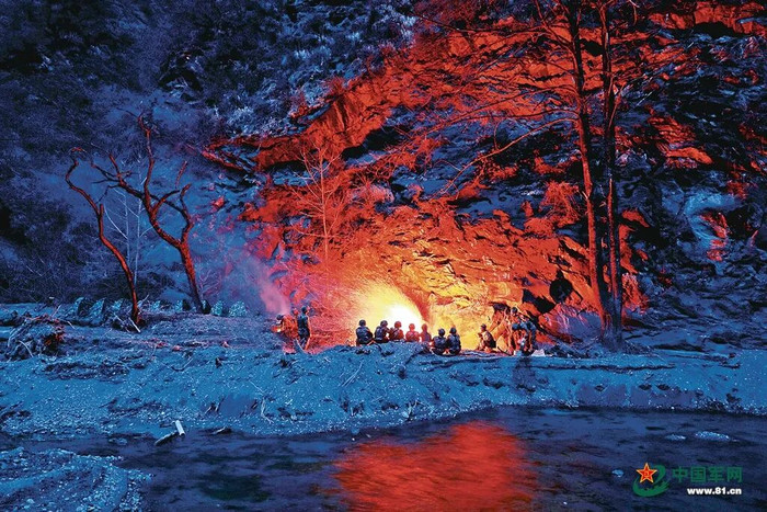 夜幕来临,部队终于行到一处背风的山坳,目前这个不到50经常米的豁达地将是民众的宿营点。燃烧篝火,驰驱了一整天的官兵开动休整。