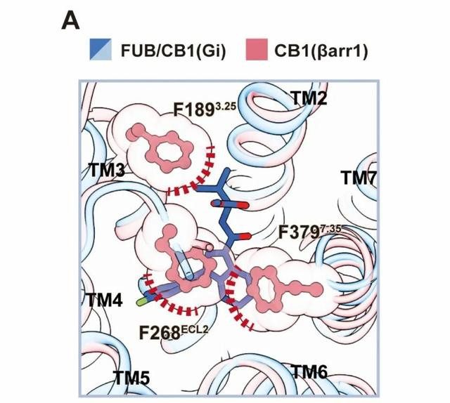 两种CB1受体复合物的结构叠加比拟:一种与Gi卵白取悦(蓝色,PDB:6n4b),另一种与β-arrestin1取悦(粉色,PDB:8wu1)