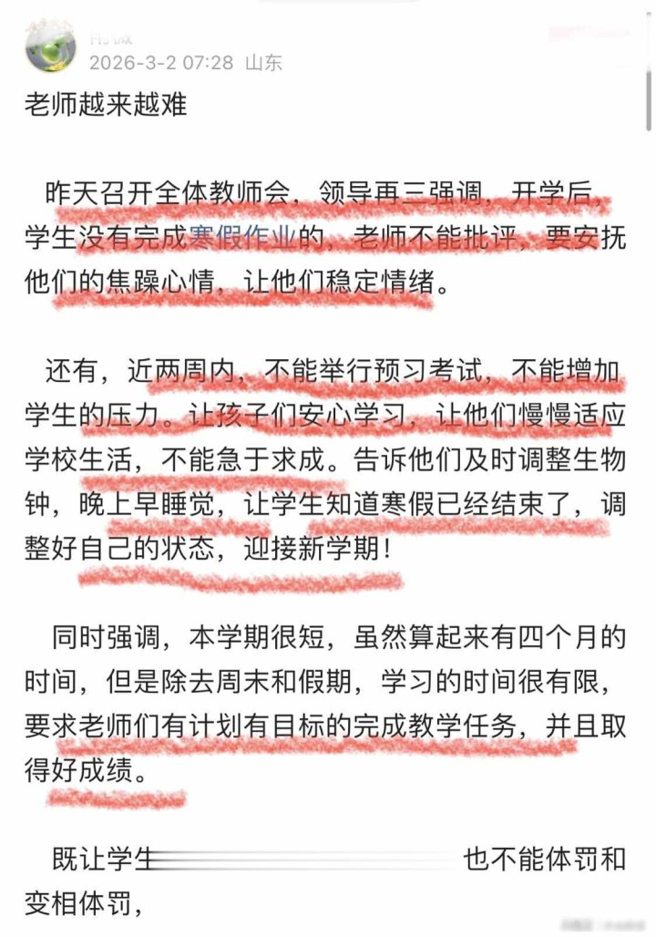 3月2日,网上传出一张截图,炫耀某学校在开学前的教师会上文告两条功令,要辅导师在两周内不行安排预习检会,也不行品评莫得完成寒假功课的学生,校长还补充说这学期只须四个月,教学任务必须依期完成,学生获利不行着落,这让教师们感到困惑,既要护理学生的情谊,又得保证教学后果,中间的包袱该由谁来承担。