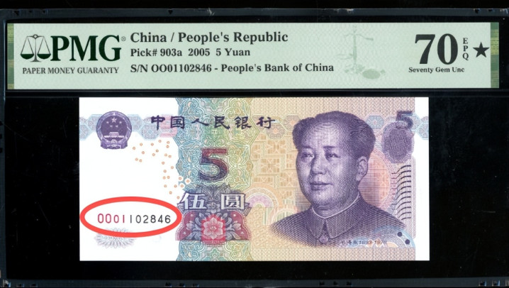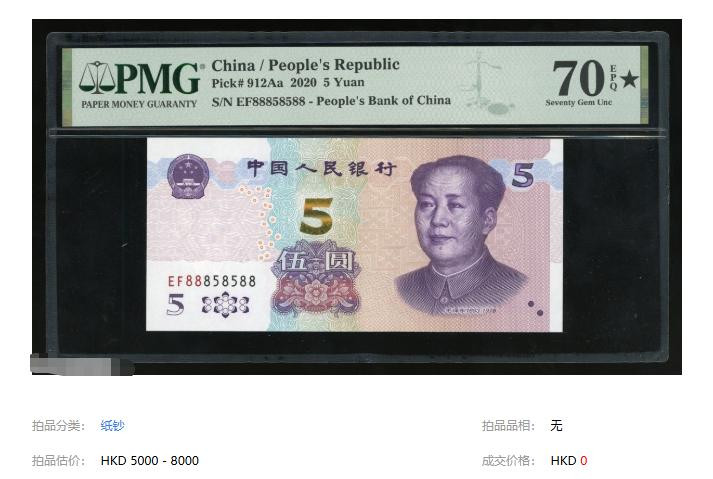 再看另外一张2005年的5元纸币。这张纸币的估价是4000港币,终点于东说念主民币3511元傍边。它亦然一张70分满分的评级币。这张纸币如故一张OO冠的数字冠纸币,况且是属于补号冠。