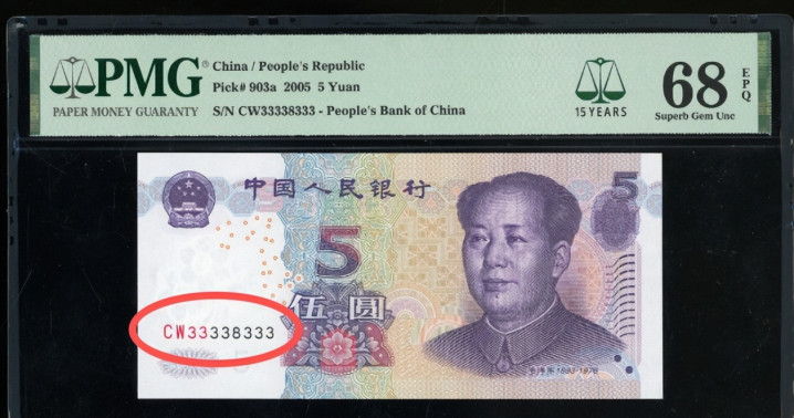 数字冠雷同补号冠,再加上70分的满分评级,让这张2005年的5元纸币储藏价钱达到了3500元傍边。