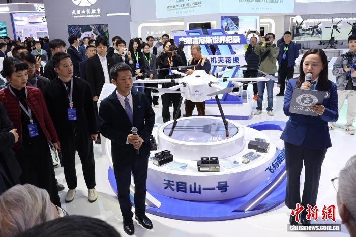 中新社杭州12月11日电 (鲍梦妮 吴启帆)第七届浙江国际智慧交通产业博览会11日在杭州开幕。现场,吉尼斯世界纪录官方认证官宣布,“天目山一号”氢动力多旋翼无人机创造了“氢燃料电池驱动的多旋翼无人机飞行的最长距离”世界纪录。