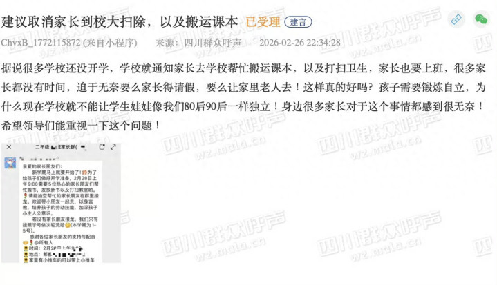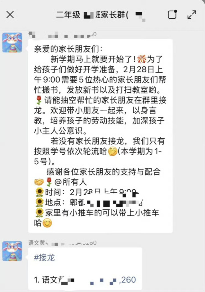 “四川大师呼声”平台上,一个家长对学校进行了举报,该家长是一位郫皆区某学校的学生家长,该家长宣称,我方孩子学校的敦厚在家长群中发了一则见知,条目知生家长在学生开学的技艺去5个到学校帮手搬书册,但愿学生家长自发报名,莫得自发报名的按学号步骤。对此,学生家长合计咫尺刚刚大师皆在使命岗亭上,压根没时辰去到学校搬书册和打扫教室,要嘛请假,开云要嘛让家里的老东谈主去,皆分别适。