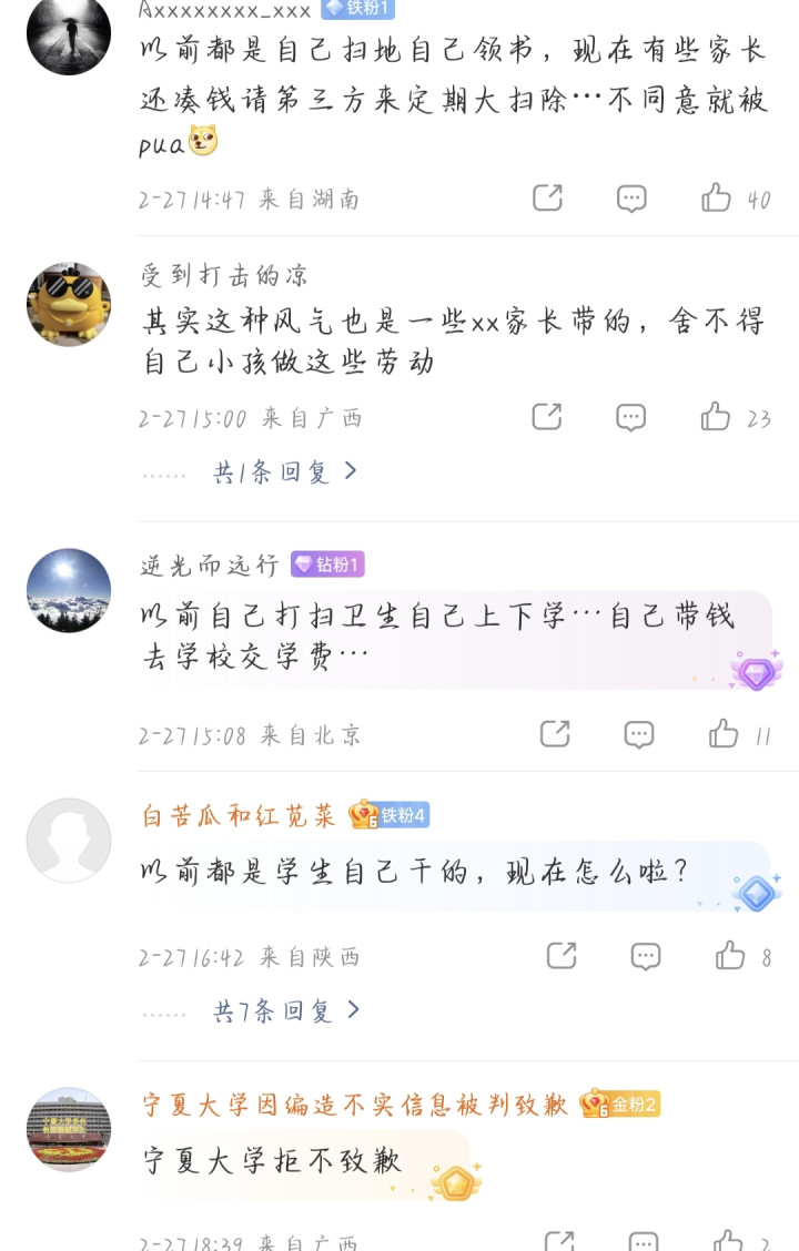 其实,不论是中学生和小学生,皆仍是有我方打扫卫生和搬运书册的智商,许多80后和90后的东谈主,曩昔念书的技艺,应该皆资历过开学时学生我方组织搬书和打扫卫生的进程,对对孩子来说亦然一种检会,莫得必要这点事也要让家长去到学校,若是中小学生连这点事皆作念不到,那培养出来的孩子又有什么用呢?