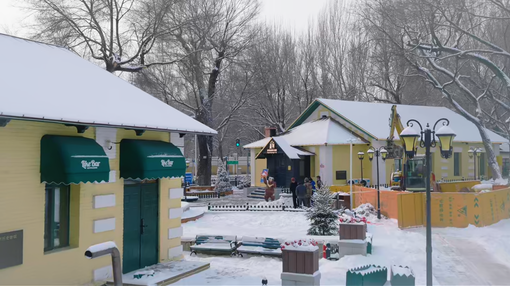 一踏入街区,一座长达15米的冰雕《八骏图》横亘街巷,晶莹剔透的骏马仿佛从黄房子的历史深处奔腾而出,阳光穿透冰体,折射出彩虹般的光晕。散布各处的8座冰雕小品,或是俄式套娃,或是芭蕾舞者,构成奇妙的视觉和弦。