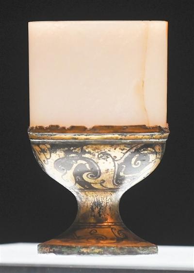 西汉鎏金铜座玉杯出土于安徽省涡阳县嵇山崖墓,由羊脂玉杯身与鎏金铜杯座组合而成。杯身呈直筒形,平口、直腹,轻薄透亮,器壁打磨光滑,下端卡入铜座。杯座上部为盏形,足部束腰,圈足呈喇叭形,内壁鎏金,外壁及底内描金,绘有应龙纹、云纹、柿蒂纹等华美纹饰。整器融合汉代制玉、鎏金及描金技法,体现了高超的工艺水平与优雅的审美品位。